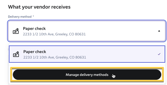 If ACH bank transfer isn't a listed delivery method, you will need to select Manage delivery methods to add it.