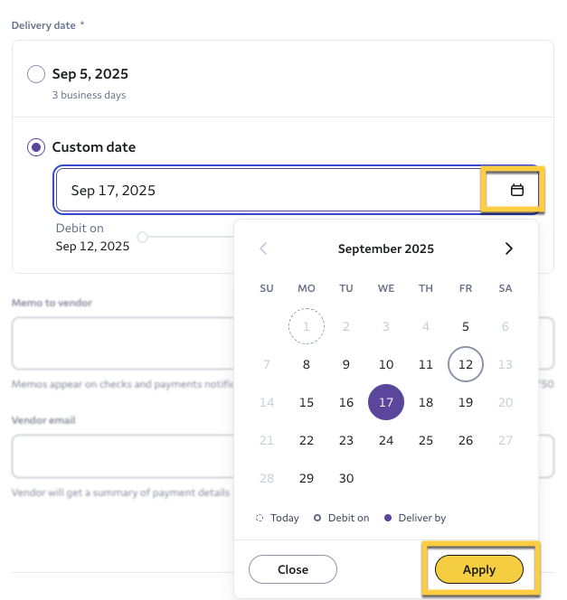 10- Choose the delivery date for the transfer. Select Custom date to pick a different delivery date. You can use the calendar icon to easily pick a date. Select Apply when done.