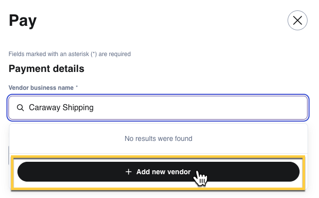 - For new vendors: Type the full business name and select + Add new vendor to create a new vendor profile.