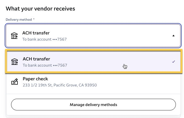 Use the dropdown menu to choose ACH bank transfer from saved delivery methods.