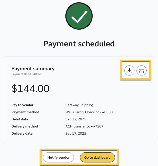 That's it! You've successfully scheduled an ACH bank transfer to your vendor. You can track the ACH bank transfer’s progress in the Payments tab.