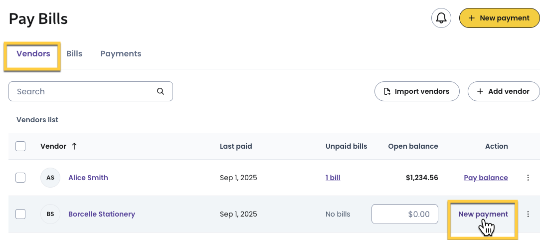 Alternatively, from the Vendors tab, find the vendor you would like to pay and select New Payment.