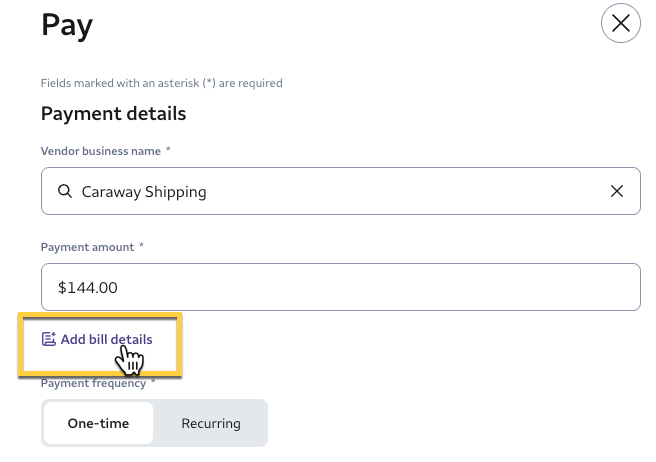 - For new vendors: Type the full business name and select + Add new vendor to create a new vendor profile.