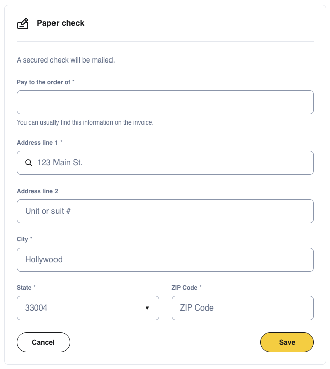 You will then be prompted to add the check delivery details. Enter the vendor's complete mailing address, including street address, city, state, and ZIP code.