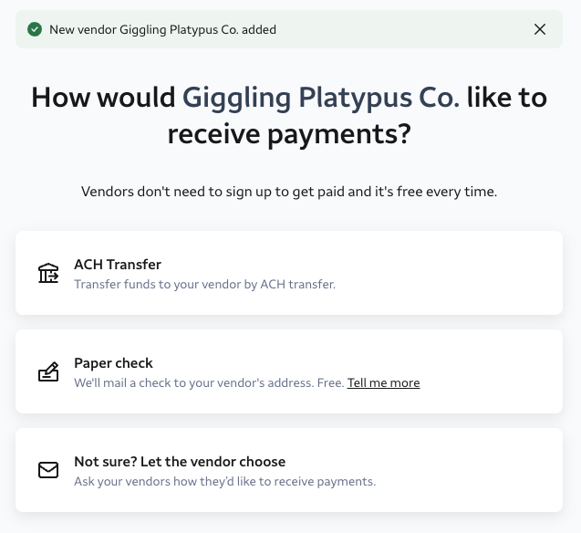 After choosing how your vendor will receive payment, your new vendor will be added to your vendor list.