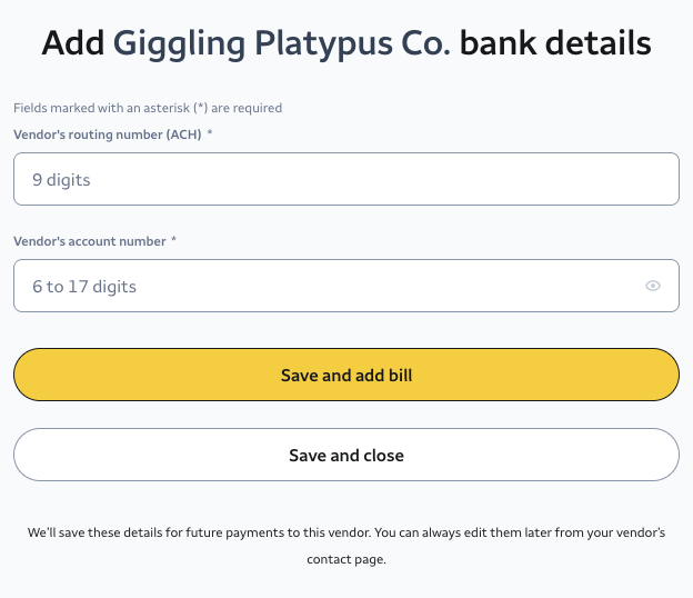 - Bank transfer (ACH): We will deposit funds directly into your vendor's bank account. You will need to enter the vendor's bank details. When done, select Save and close to save these details for future payments. To save your vendor's details and add a bill, select Save and add bill.