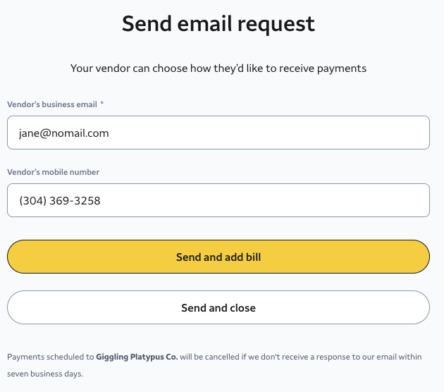 - Let the vendor choose: If you are unsure how the vendor would prefer to be paid, you can let the vendor choose for themselves. Please provide the vendor's email address so we can email them and ask them to securely select how they prefer to be paid. When done, select Save and close to save these details for future payments. To save your vendor's details and add a bill, select Save and add bill.