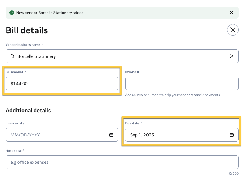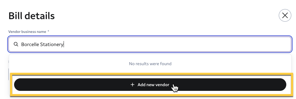 3- On the Bill details page, type the vendor's name in the Vendor business name field.