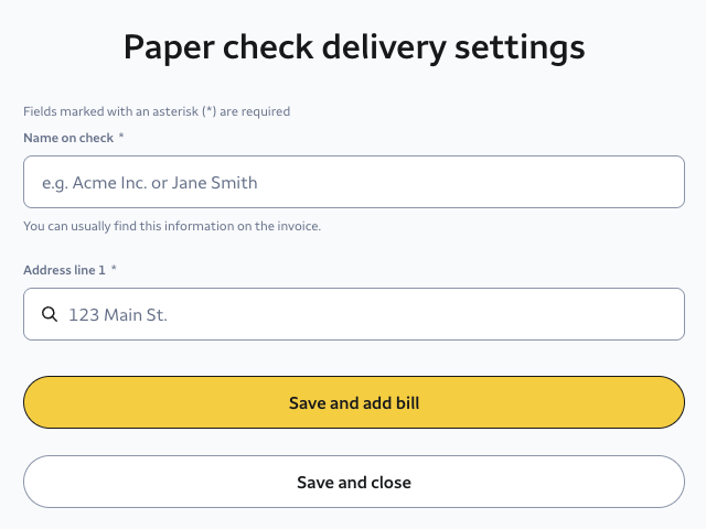 - Paper check: We will print and mail a check to your vendor's address. You will need to add the mailing details for your vendor. When done, select Save and close to save these details for future payments. To save your vendor's details and add a bill, select Save and add bill.
