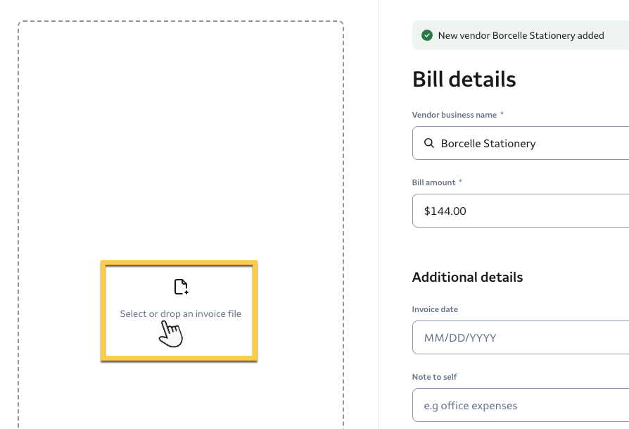7- (Optional) You can attach an invoice to your bill by clicking Select or drop an invoice file. You can then select an invoice file from your device. The invoice will be uploaded and then scanned for information to add to the payment. Review the automatically scanned details and make any necessary edits.