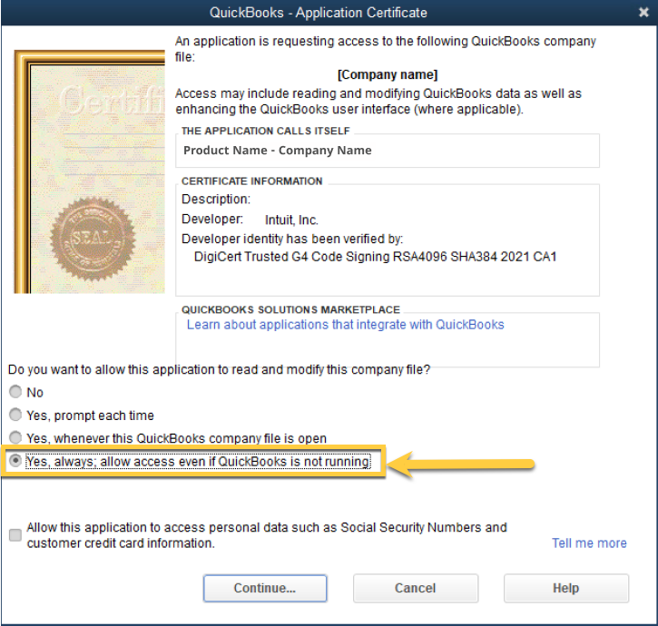 4- In QuickBooks - Application Certificate, select Yes, always; allow access even if QuickBooks is not running.