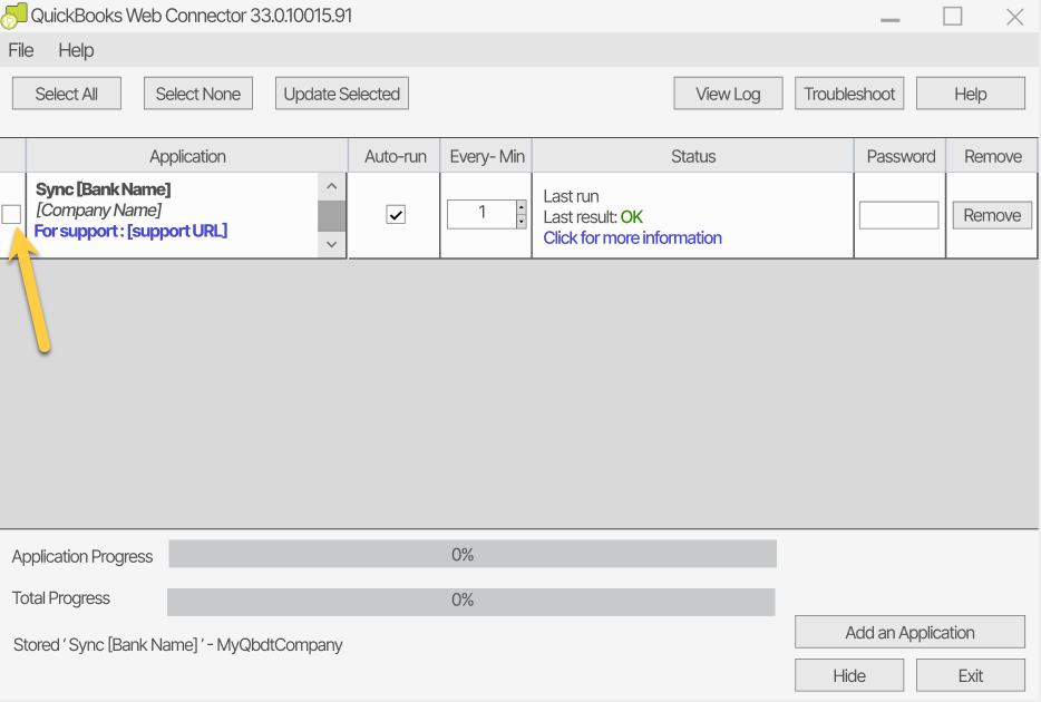 1- In QuickBooks Web Connector, check the box next to the business account you wish to sync.