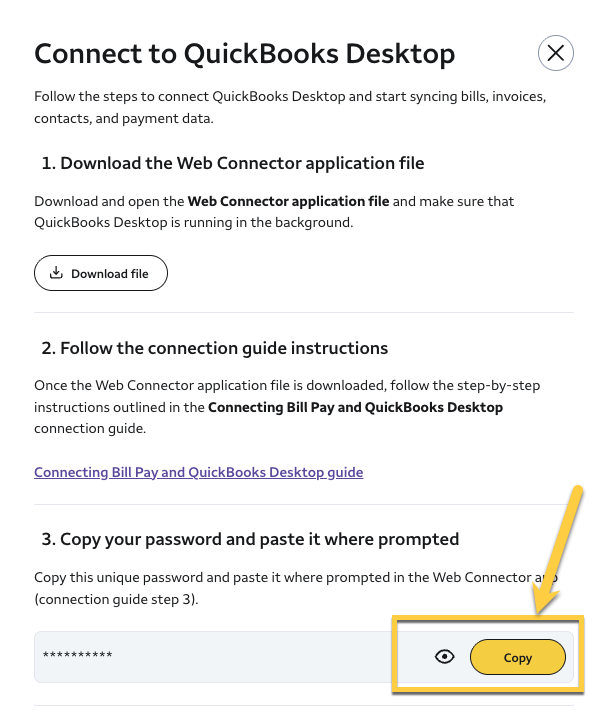 Step 3: Copy your password from your Bill Manager account and paste it where prompted in QuickBooks Desktop.