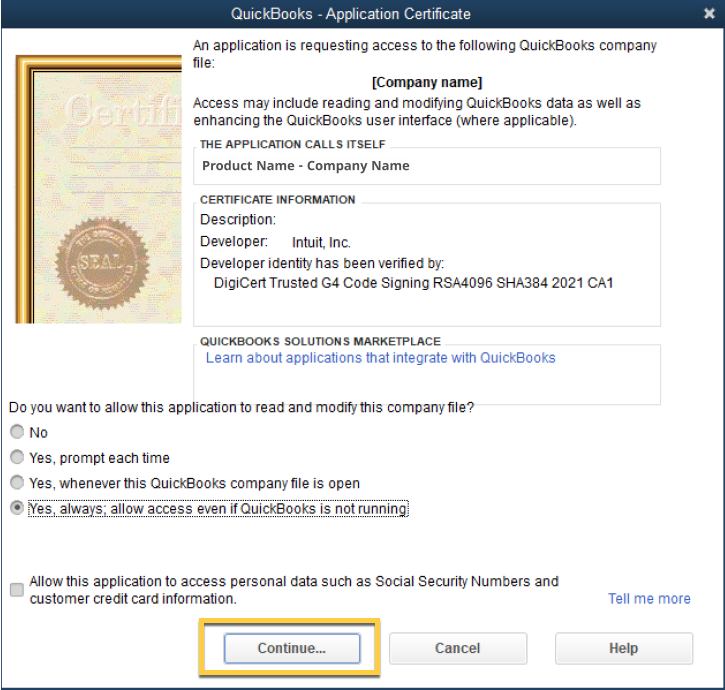 6- In QuickBooks - Application Certificate, select Continue.