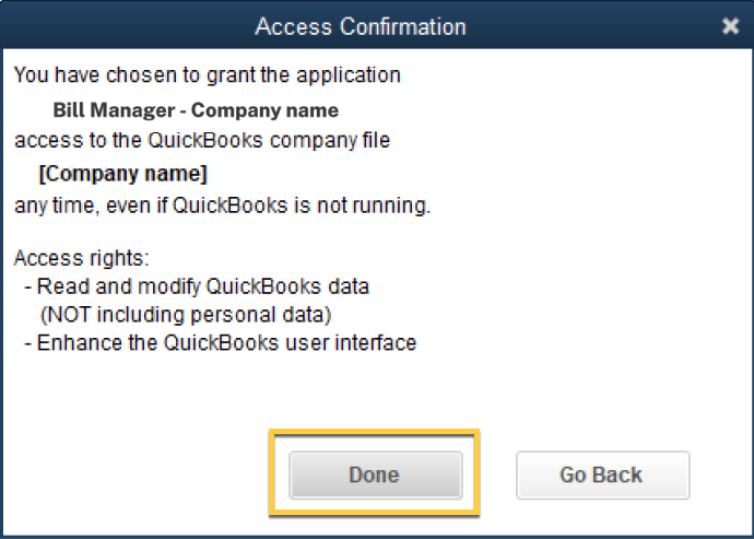 7- The Access Confirmation pop-up will now appear. In the Access Confirmation, select Done to approve.