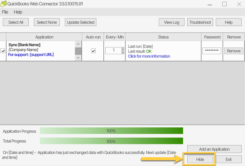 7- Leave the web connector running in the background by selecting Hide.