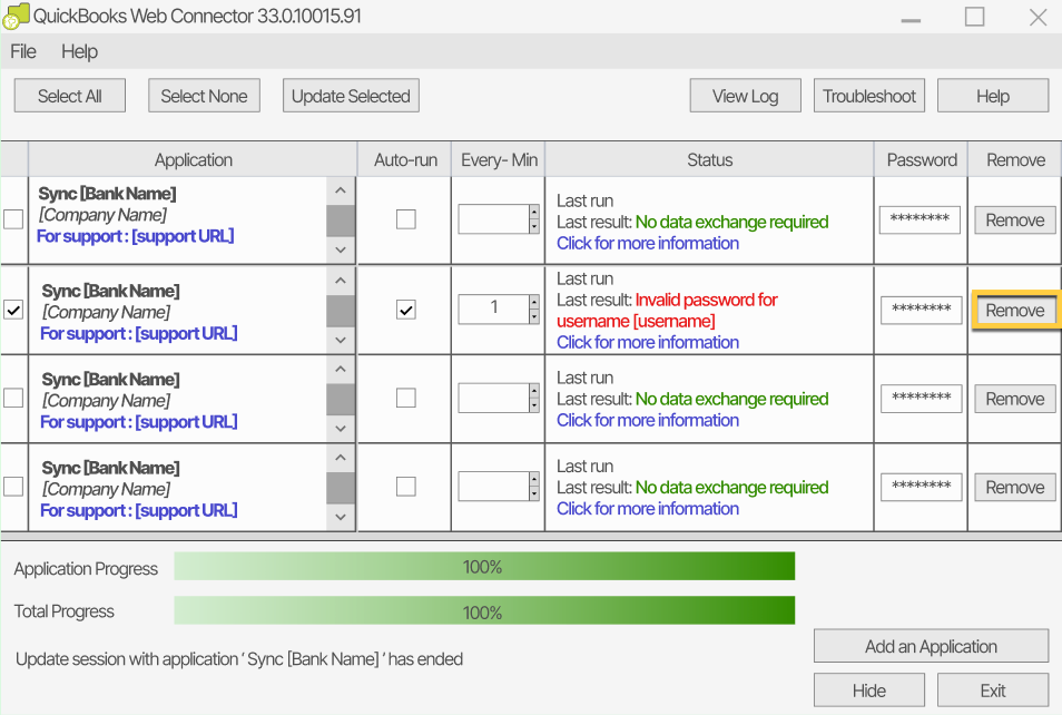 To fix this error, follow the steps below to remove the old application from QuickBooks Web Connector and close it.