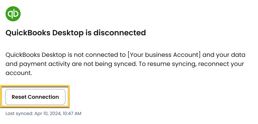 Sometimes, you may need to disconnect your QuickBooks Desktop. You can always restore the connection by selecting Reset Connection in your Sync and Import settings.