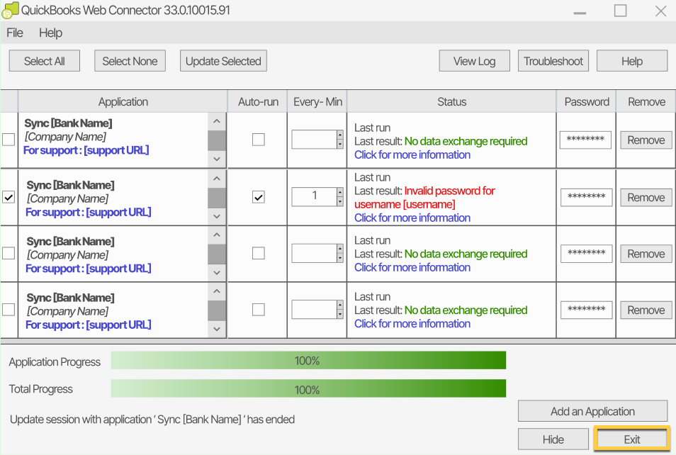 4- After removing the old application, select Exit to close the QuickBooks Web Connector.