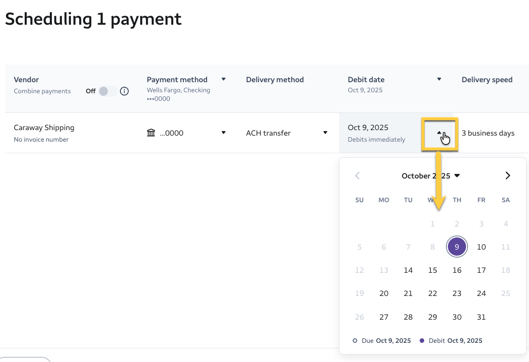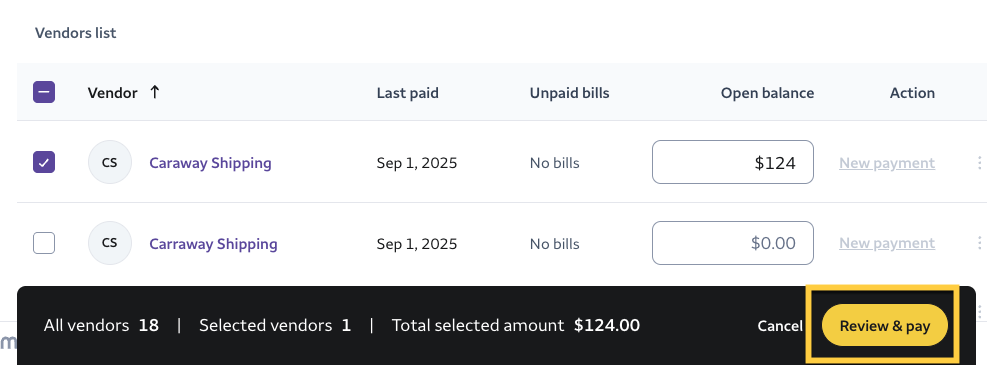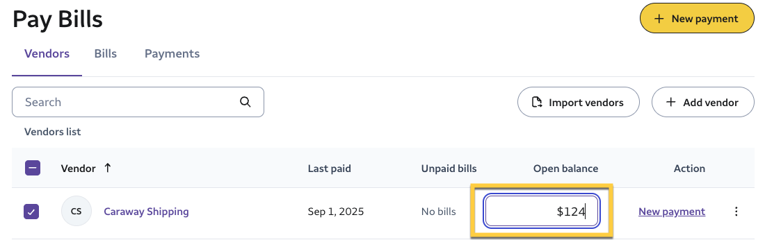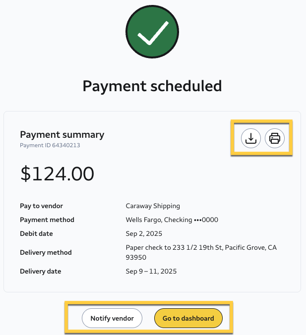 That's it! You've successfully scheduled a vendor payment without creating a bill. You can find your new payment in the Payments tab. Your payment details are saved, and funds will be delivered according to your selected timeline and method.