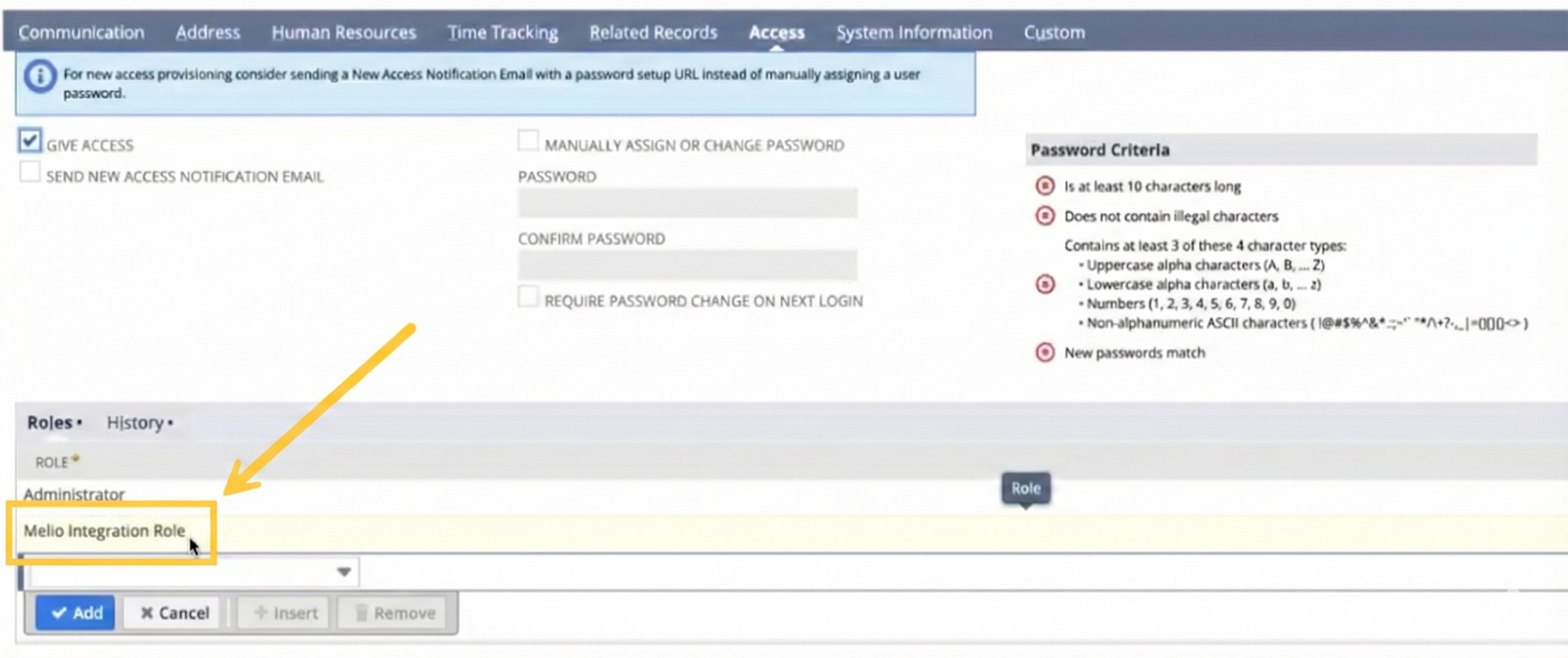 - User: Select the user you assigned the Melio integration role to in the previous step.
