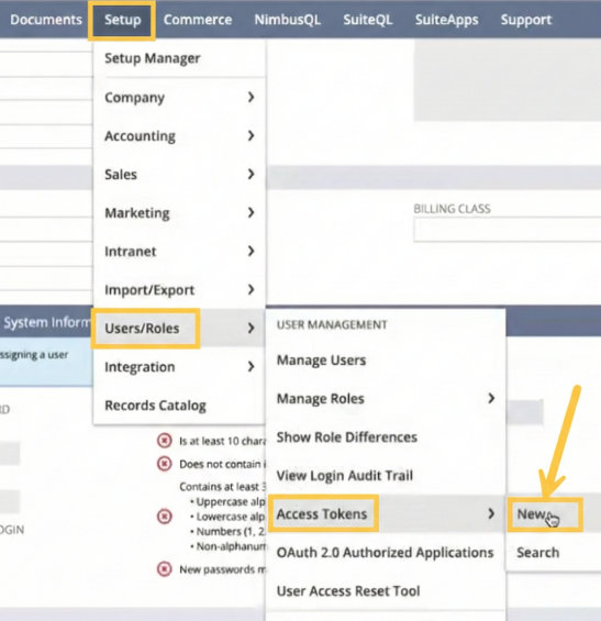 1 - In your NetSuite account, go to Setup -> Users/Roles -> Access Tokens and select New Access Token.