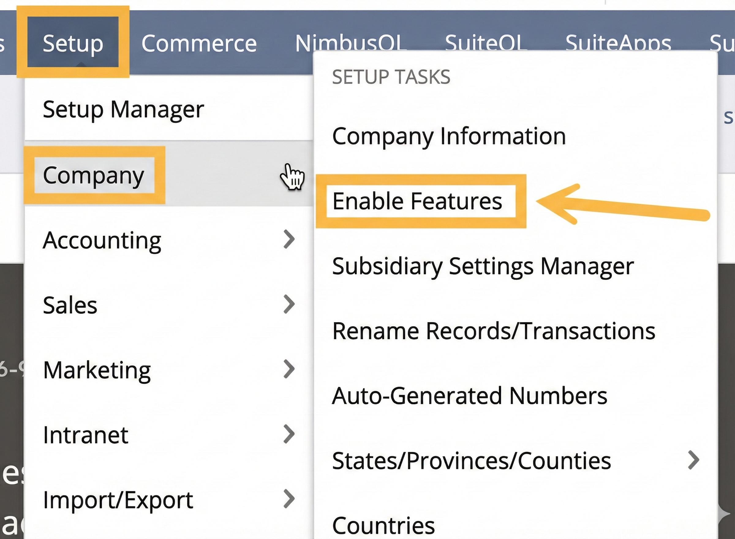 1 - In your NetSuite account, navigate to Setup -> Company -> Enable Features.
