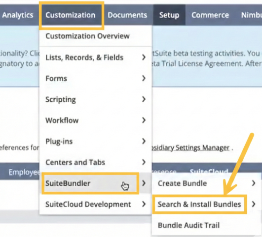1 - In your NetSuite account, go to Customization -> SuiteBundler -> Search & Install Bundles.
