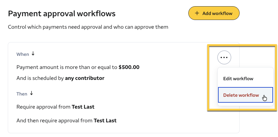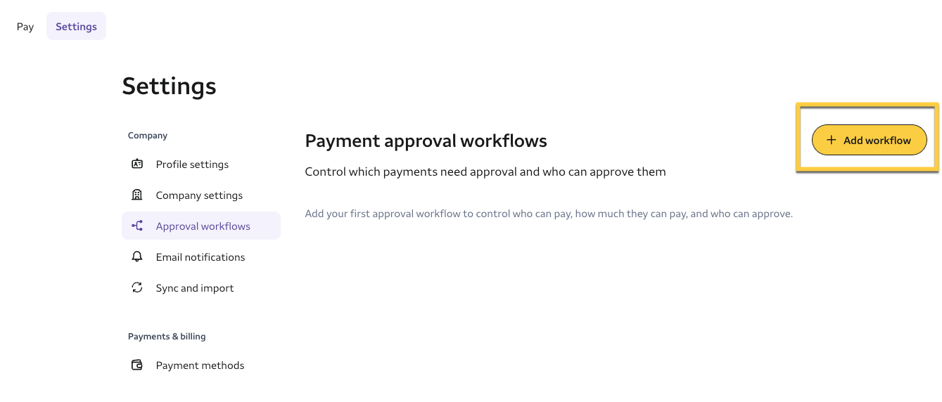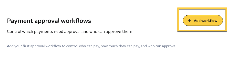 4- In Payment approval workflows on the right side of your screen, select + Add workflow.