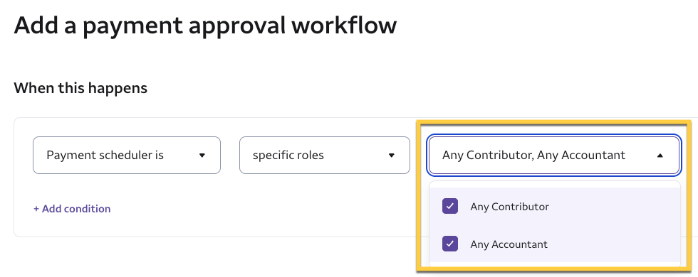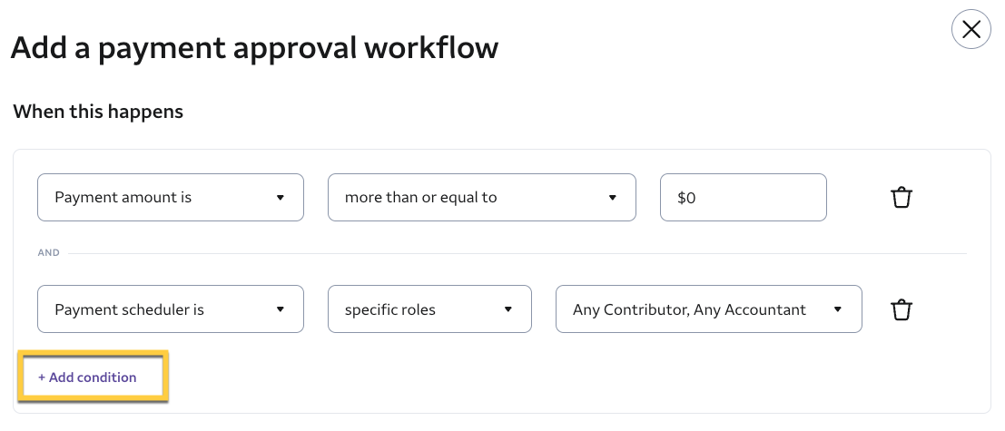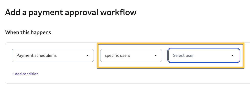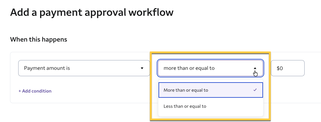 c. You can set more than one condition by selecting + Add condition. For example, you can require approval for payments over a certain amount made by a specific user.