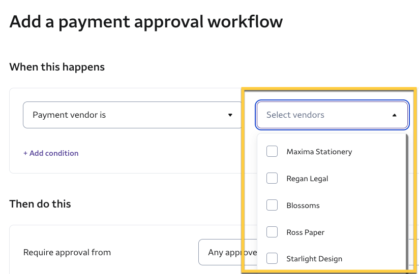 - Vendor: Choose one or more vendors for whom payments will require approval.