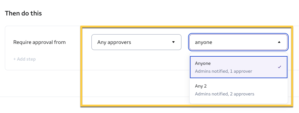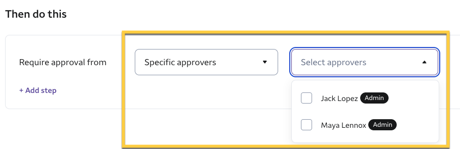 5- Under Then do this, choose who needs to approve the payment. The chosen users (team members) will be notified whenever there is an approval they will need to make. Here are the kinds of approvers you can add: