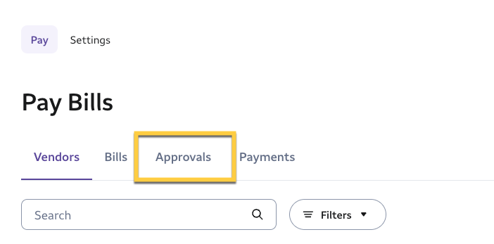 2- In the Pay Bills dashboard, select the Approvals tab. The account owner and all admins in a company will see an Approvals tab with payments that require approval.