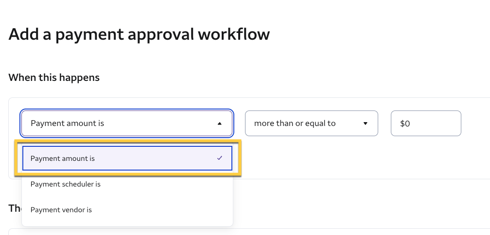 1- On the Add a payment approval workflow page, set the criteria for when a payment requires approval. You can set it per amount, per scheduler, and/or per vendor.