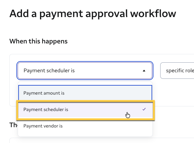 - Payment scheduler: Set the approval workflow to apply to a specific user or a specific role on your team who schedules the payment.